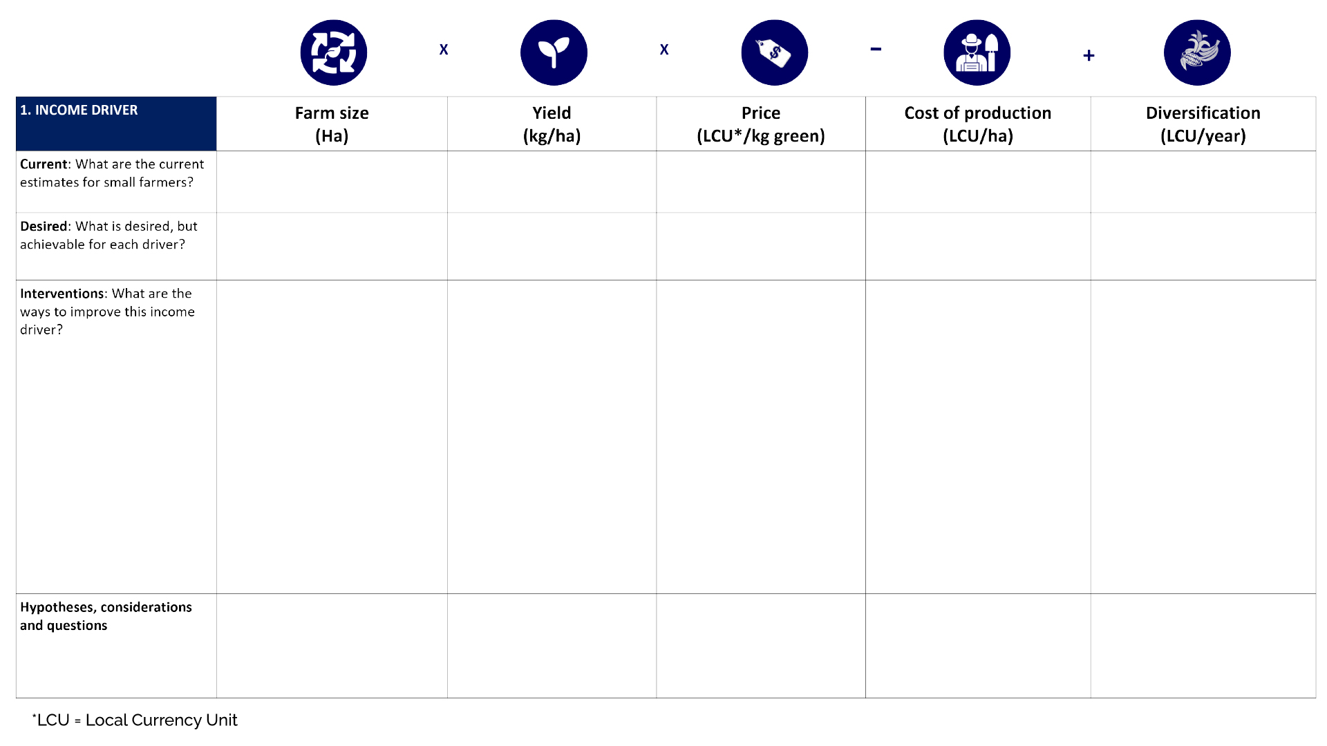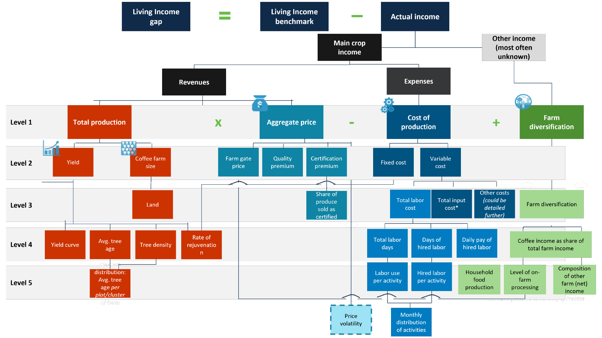 You can do this using a ‘optimization analysis’: determine the ‘constraints’ per farmer archetype as to determine which variables should change by what rate to e.g. reach a living income.