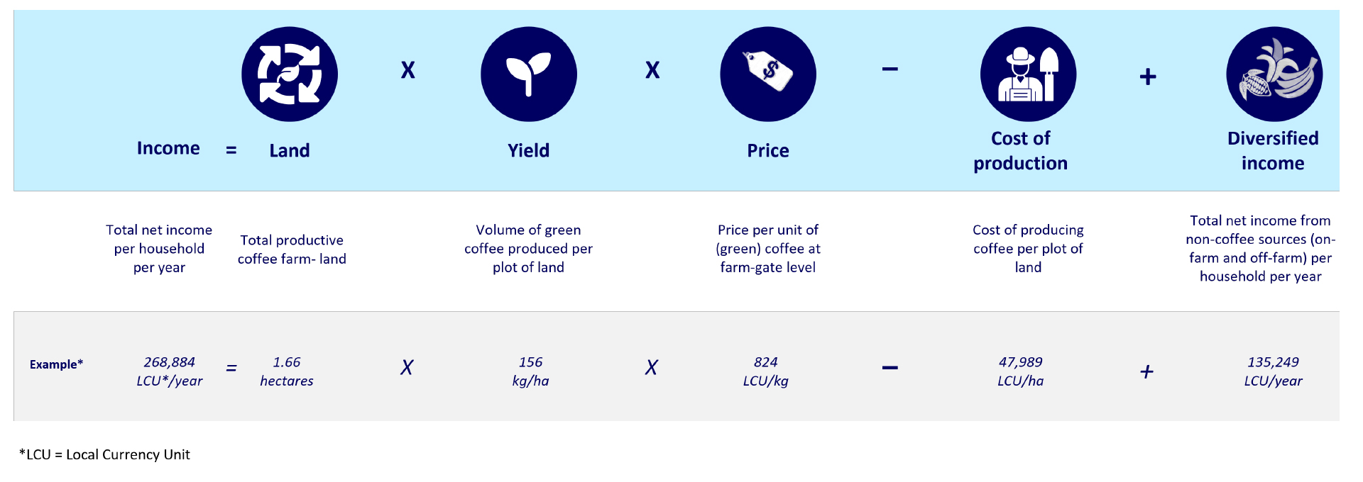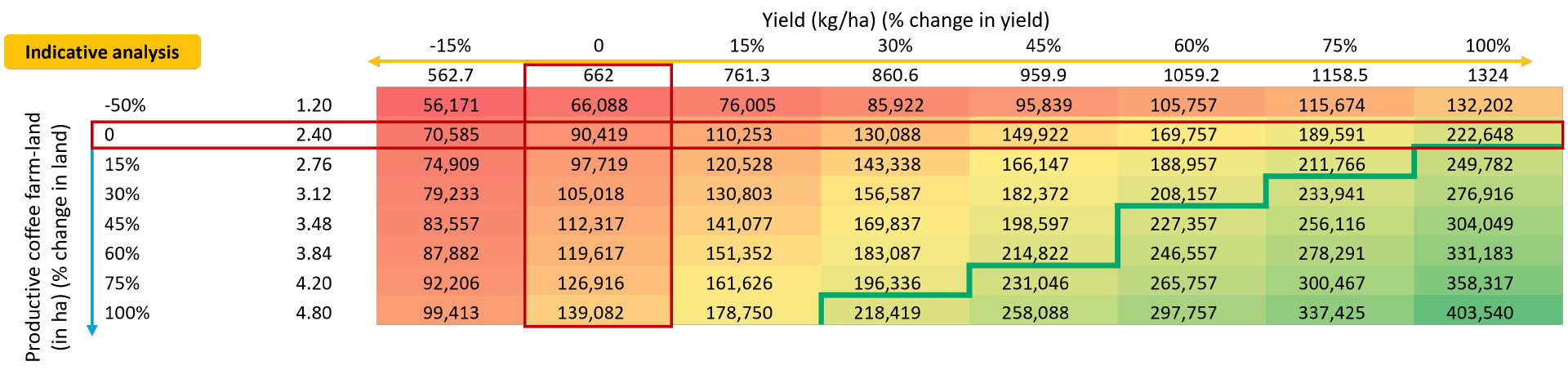Explanation: The numbers in the colored boxes show the household income (including non-coffee income). The horizontal axis shows variation in yields, while the vertical axis represents variation in productive coffee farm-land. The red boxes highlight the current levels. The blue box indicates the income above the threshold of the Living Income.