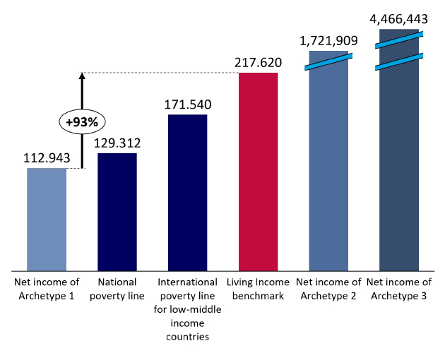 As an example, you can find below the results of calculating the income gap using indicative data from Country X, based on different benchmarks and Archetypes (indicating that 94% of farmers earn below the poverty line and Living Income benchmark):