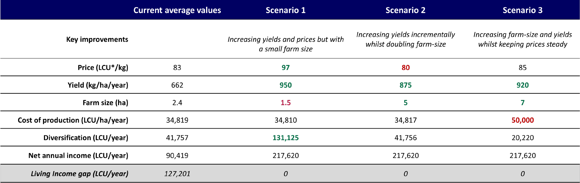 The scenario analysis in the table shows how the prices, yield and farm size should change in a scenario where cost of production and diversification is maintained at current levels