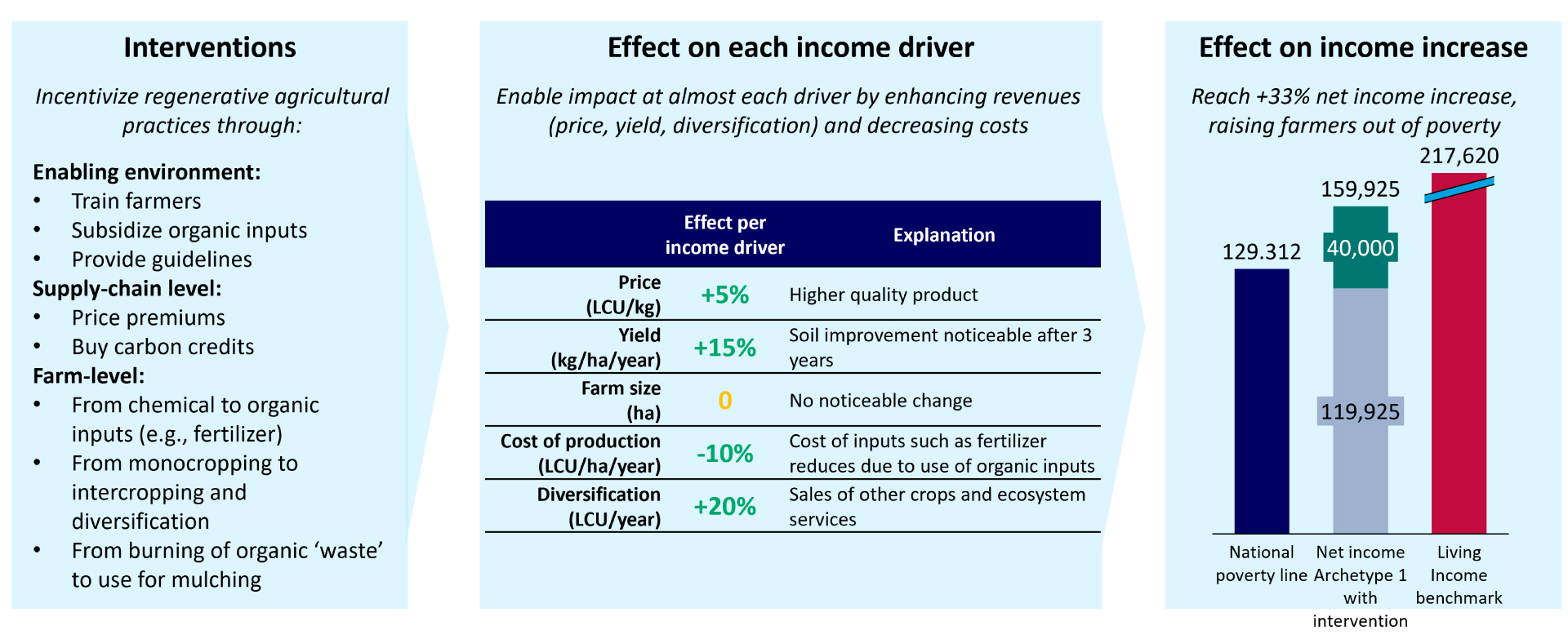 Here is an example of how different interventions can impact incomes (working at three different intervention levels: Enabling environment; Supply-chain level and Farm-level). In this example, interventions are made to incentivize regenerative agricultural practices: