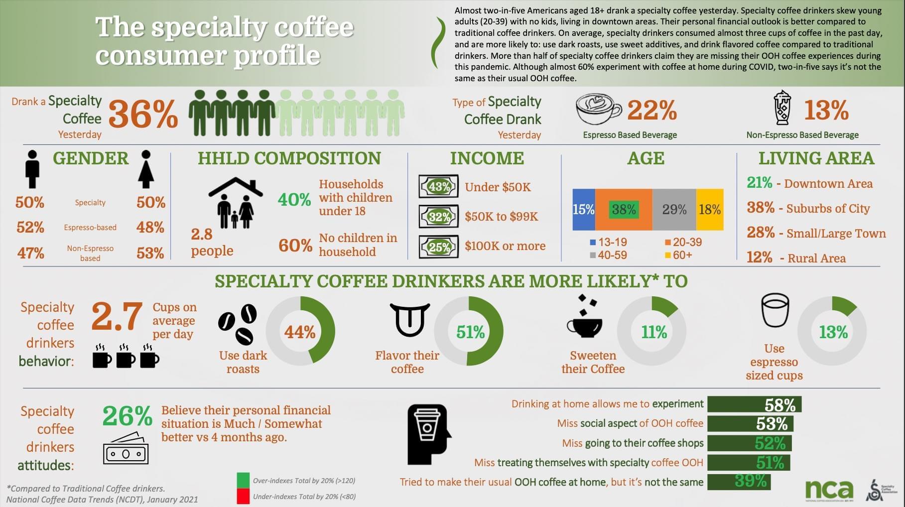 The infographic below, taken from the 2021 National Coffee Data Trends Specialty Coffee Report produced by the National Coffee Association of the USA, shows the specialty coffee consumer profile.